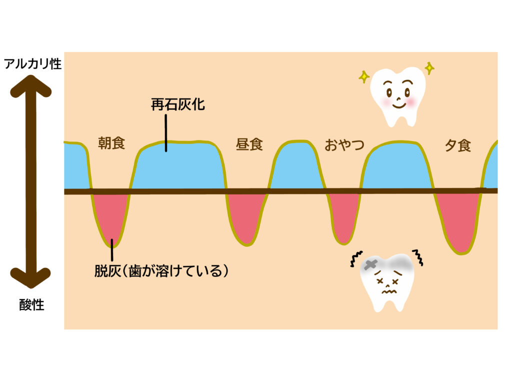 口の中が酸性に傾いている時間が長くなり、歯の表面が溶けやすくなります。